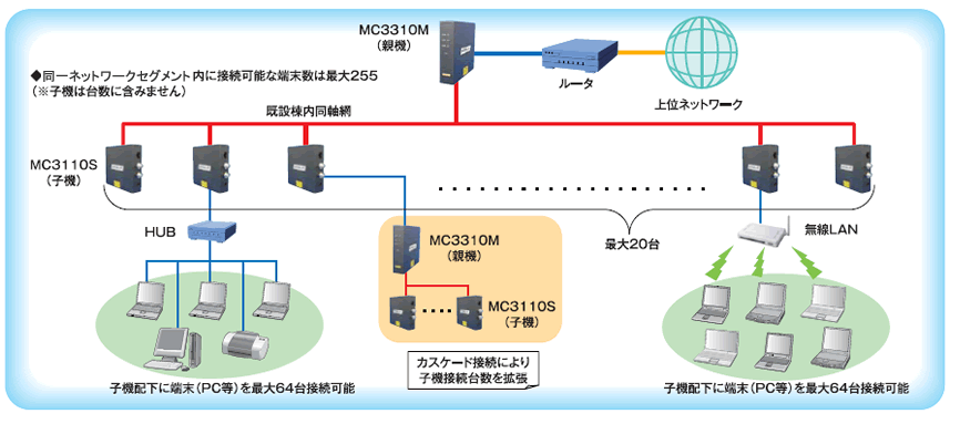 (注1)1対向の片方向通信時の最大実効速度(UDP)は約90Mbpsです。 (注2)カスケード接続により100台以上の接続も可能 (注3)モデム1台あたり端末(PC等)を最大64台まで接続可能。 (注4)Auto-negotiation、Auto MDI/MDI-X
