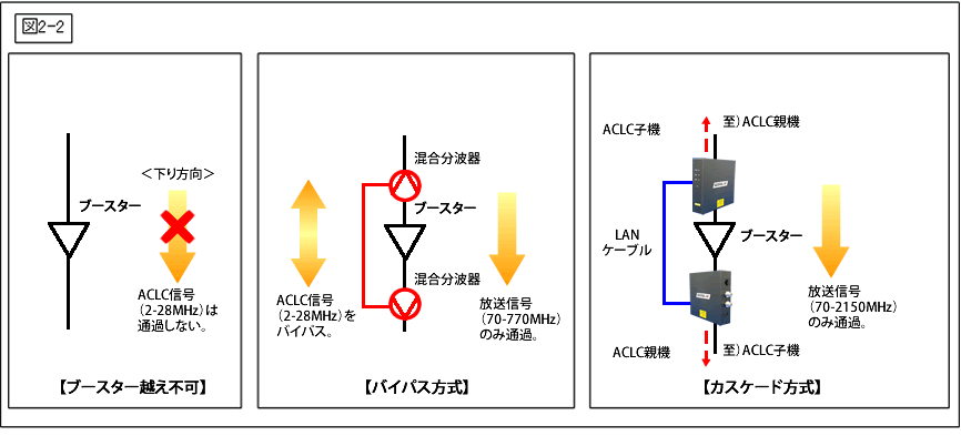 これを回避する方法として、混合分波器を用いてバイパスする方法と、ブースターの上部と下部で同軸通信のセグメントを分けて、イーサネットケーブルでバイパスする方法があります。(下図参照)