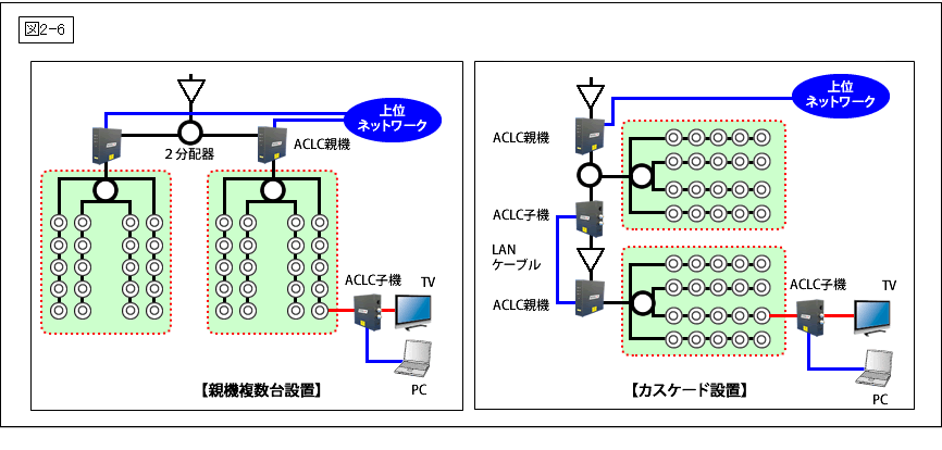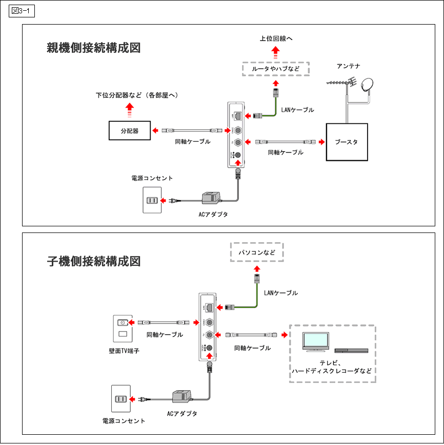但し、ケーブルテレビの双方向通信サービス(IP電話、有料放送)や有線放送を利用している場合は、同軸通信の周波数と干渉する場合があります。この場合、本製品を使用することはできません。また、ホテルでは、客室管理用途でTV共聴線を利用したデータ通信を行っている場合がありますので、どの周波数帯を使っているか導入前に確認して下さい。
