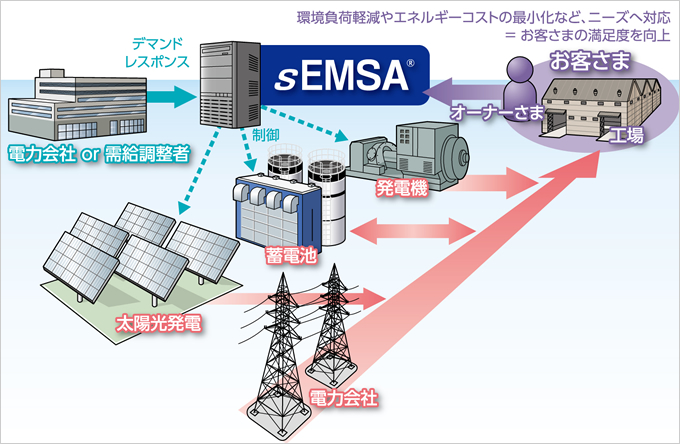 sEMSA®とは当社が開発した、再生可能エネルギーを含む多様な分散電源を使って需要家にとって最適となるように電力を運用できるエネルギー・マネジメント・システムのことです。発電設備と蓄電設備の機能を最適に管理・制御することで、電力コストの低減や省エネ効果を発揮することができます。