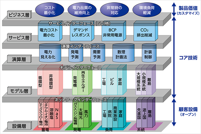 当社はエネルギーマネジメントにおける機能を階層化し、右図に示すアーキテクチャに沿って開発を進めています。層内における各機能はモジュール(※1)化されており、sEMSA®は必要なモジュールを組み合わせて構成することが可能です。これにより、大規模需要家から家庭まで多様な顧客ニーズや分散電源に対して短納期・低コストに対応することができます。