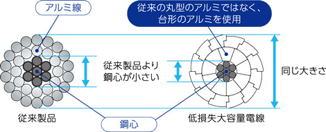 当社が開発した低損失大容量電線は、鋼心部分に従来の1.3倍の強度を持つ材料を採用することで鋼心を小径化し、その外側に台形状のアルミ線を隙間なく配置し、アルミ占積率を高めています。