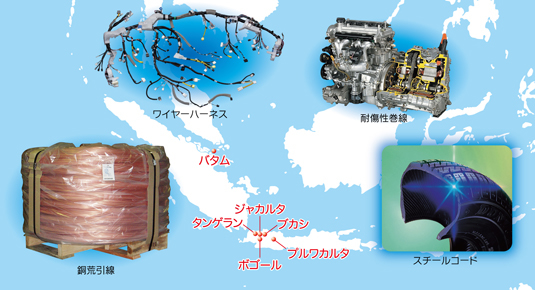 住友電工グループが取り扱う銅荒引線・銅線の約40%(約1万2千t/月)を生産・販売しています。アジアの自動車・巻線・エレクトロニクス・電力などの住友電工グループ関係各社向け中心に納入しています。