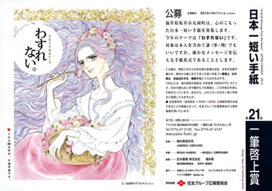 今回のテーマは「わすれない」です。1~40文字までの短い書簡に込められたみなさまの日本一短い「わすれない」の手紙文を奮ってご応募ください。