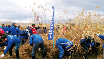 1月26日(日)に大津市雄琴で開催された、大津市主催の琵琶湖のヨシ刈りに参加しました。当社は、グループ社員や家族の参加も含め約30名が集まりました。