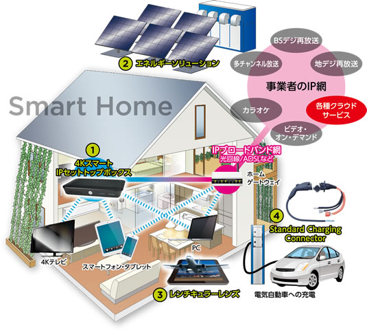 4KスマートIPセットトップボックスとは、IPブロードバンド回線を経由してTVに映像コンテンツやさまざまな付加価値サービスを配信するIPTVサービスの受信端末のことです。テレビ番組や観たい時にさまざまなコンテンツを視聴できるビデオ・オン・デマンドのほか、コミュニティ情報、ゲーム、ショップなどのクラウドサービスを利用することができます。さらに、スマートフォンやタブレット端末などへ録画コンテンツを配信し、家中どこでも映像を楽しむことができます。会場では4K画質※に対応した製品「ST4114」を展示し、実際に4Kテレビでの映像をご覧いただけます。